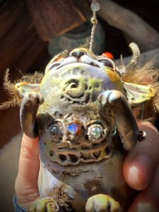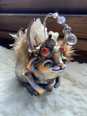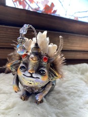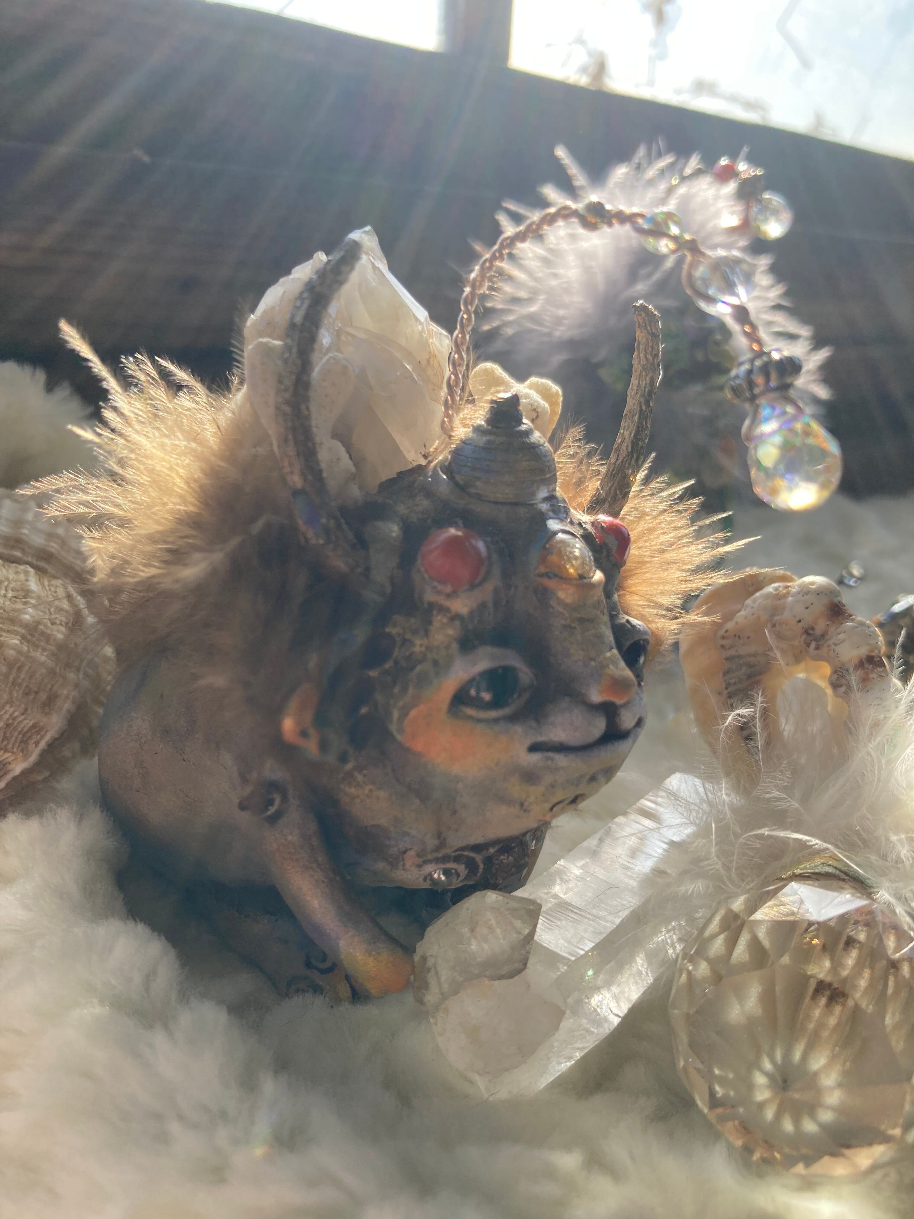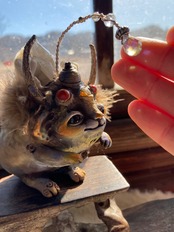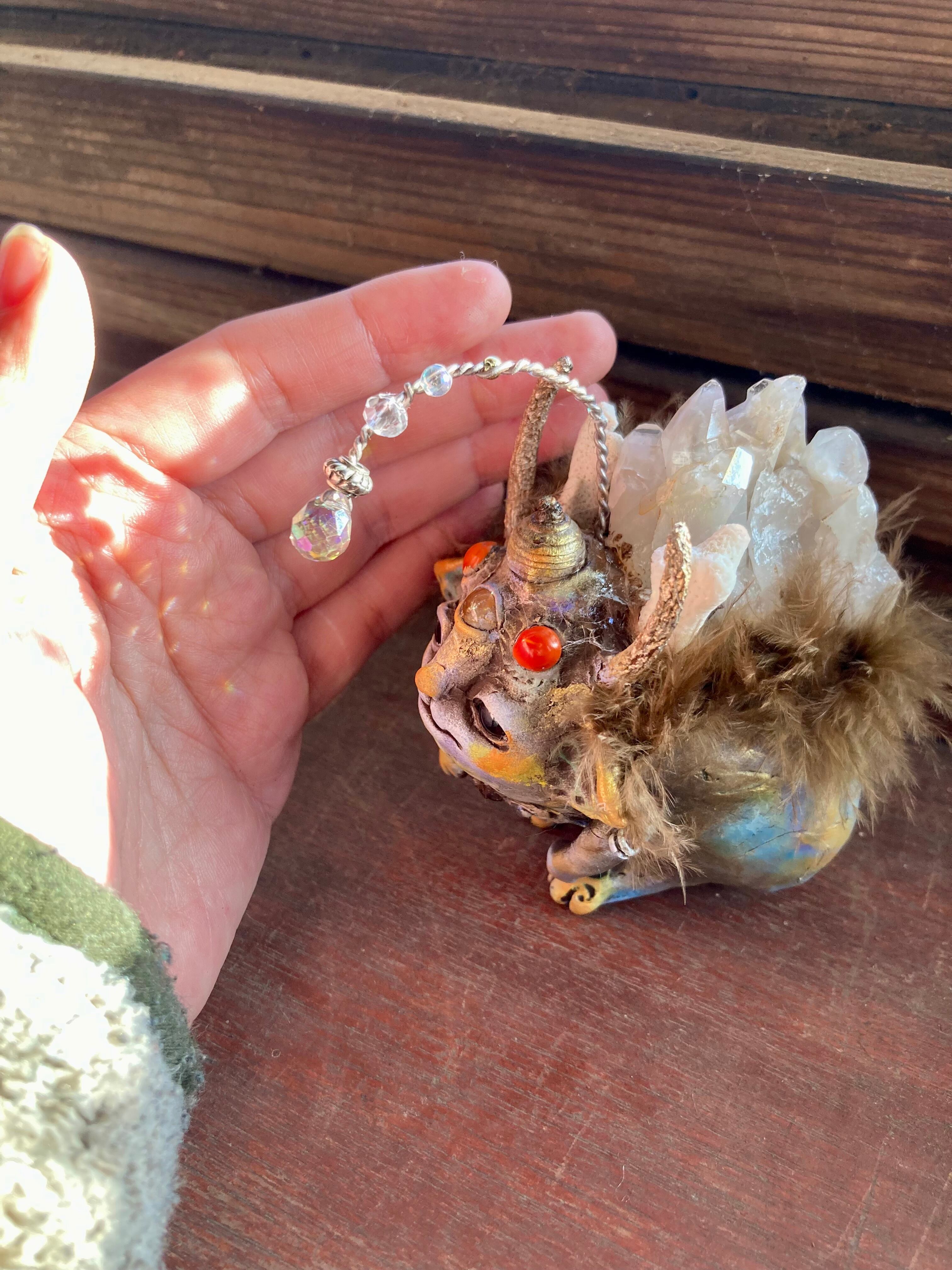 サンキャッチャーのちょうちんとスパイダーガムのツノ、どんぐりの帽子をかぶっていて、頭上のサンキャッチャーから小さな虹をお届けします⭐︎